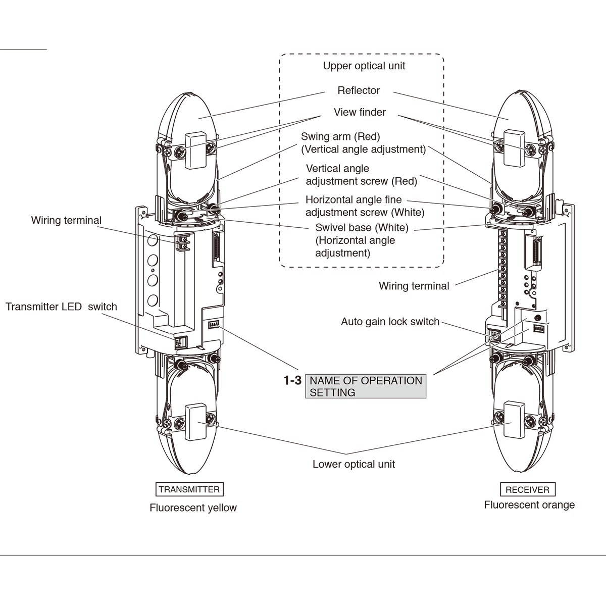 Fonctions: Sélection de la fréquence du faisceau modulé, Indicateur de tonalité, Module environnemental, Sélection de la puissance du faisceau, Réglage de la puissance d’émission, Indication de la mémoire d’alarme, AGC programmé, Fonction de verrouillage automatique du gain, Prise de contrôle, Réglage du temps de réponse, Commutateur de faisceau supérieur/inférieur, Contrôleur sans fil