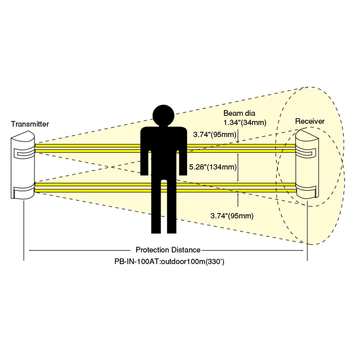Grâce au traitement de l’unité centrale, le récepteur supérieur sélectionne le faisceau de l’émetteur supérieur et le récepteur inférieur sélectionne le faisceau de l’émetteur inférieur, créant ainsi un système de détection de type ET/OU.