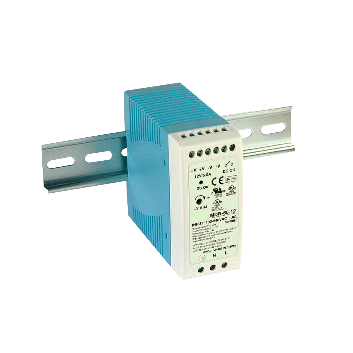 L’alimentatore KBC MDR-60-12 12VDC 60W su guida DIN per dispositivi IP industriali con ingresso a 12V.