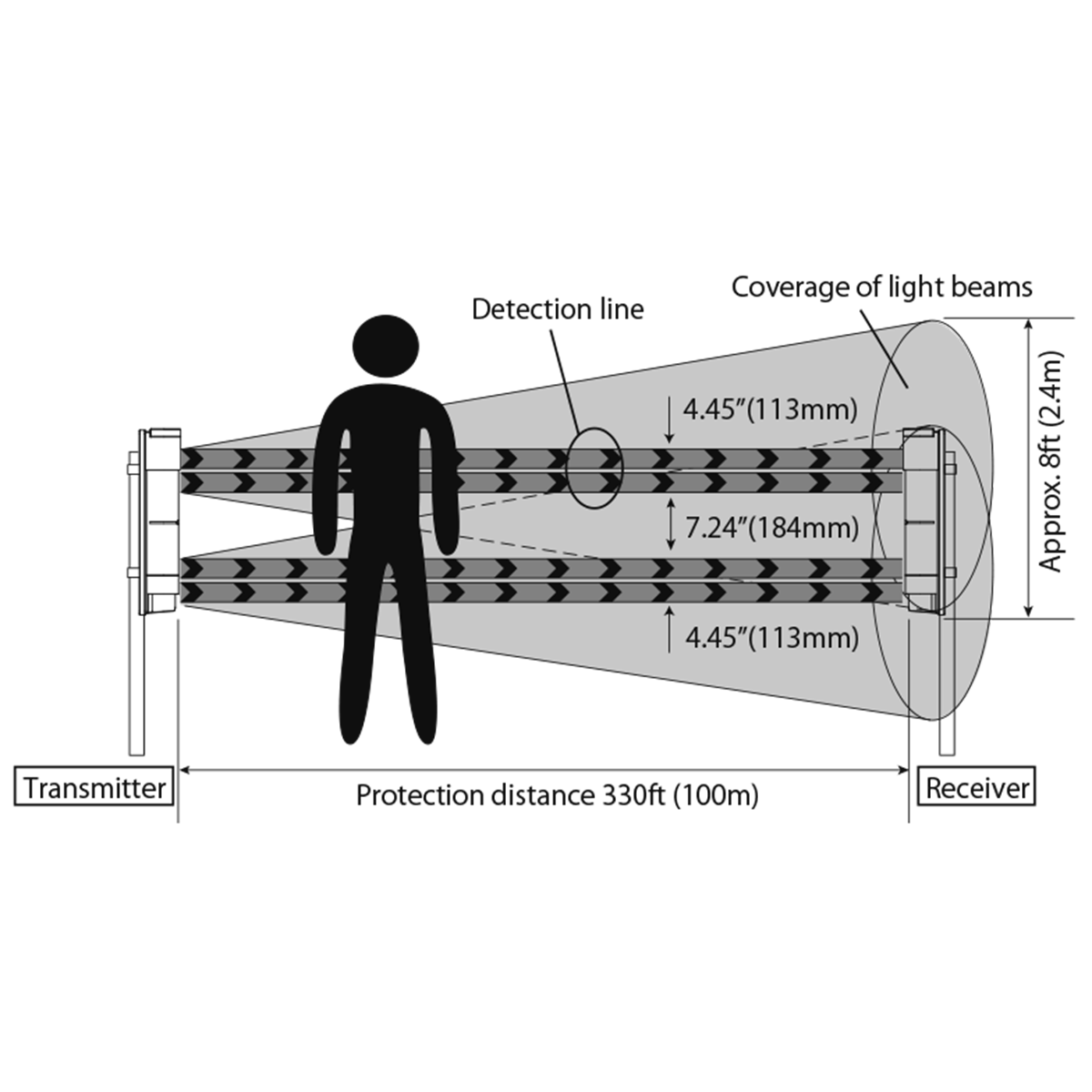 • Sistema di rilevamento: Sistema di interruzione del fascio pulsato nel vicino infrarosso (interruzione simultanea del fascio TX-RX 4)